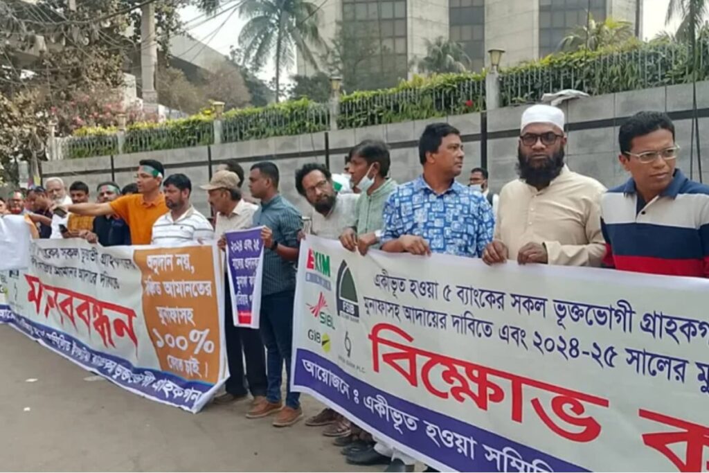 একীভূত হওয়া পাঁচটি শরিয়াহভিত্তিক ব্যাংক নিয়ে গঠিত ‘সম্মিলিত ইসলামী ব্যাংকের’ আমানতকারীরা তাদের জমানো টাকা ফেরত এবং ‘হেয়ার কাট’ সিদ্ধান্ত বাতিলের দাবিতে রাজপথে নেমেছেন। বৃহস্পতিবার (৫ মার্চ) রাজধানীর মতিঝিলে বাংলাদেশ ব্যাংকের প্রধান কার্যালয়ের সামনে ‘আমানতকারী’ ব্যানারে এই মানববন্ধন ও অবস্থান কর্মসূচি পালন করা হয়।