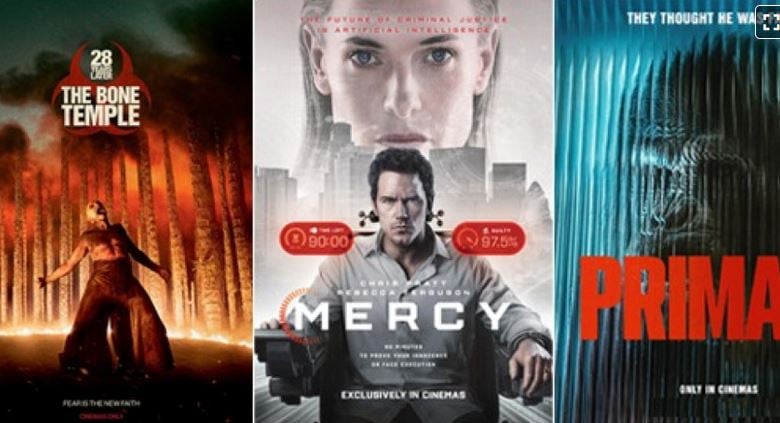 আগামীকাল, ৯ ফেব্রুয়ারি একসঙ্গে তিনটি হলিউড সিনেমা মুক্তি পাচ্ছে স্টার সিনেপ্লেক্সে। তালিকায় রয়েছে ‘২৮ ইয়ার্স লেটার: দ্য বোন টেম্পল’, বৈজ্ঞানিক কল্পকাহিনীভিত্তিক ‘মার্সি’ এবং হরর সিনেমা ‘প্রাইমেট’। যুক্তরাষ্ট্রসহ বিভিন্ন দেশে মুক্তির পরই সিনেমাগুলো দর্শক ও সমালোচকদের নজর কেড়েছে।