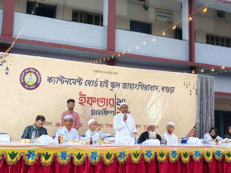 বগুড়ার ক্যান্টনমেন্ট বোর্ড হাইস্কুল জাহাঙ্গীরাবাদ প্রাঙ্গণে প্রাক্তন শিক্ষার্থীদের উদ্যোগে এক আন্তরিক ও স্মৃতিময় ইফতার মাহফিল অনুষ্ঠিত হয়েছে। বুধবার (১৮ মার্চ ) বিকেলে আয়োজিত এ অনুষ্ঠানে প্রাক্তন ছাত্র-ছাত্রী, শিক্ষক ও বর্তমান শিক্ষার্থীদের অংশগ্রহণে মুখর হয়ে ওঠে পুরো ক্যাম্পাস।