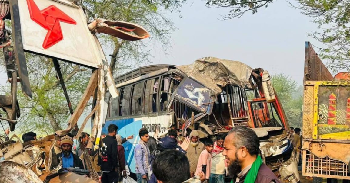 পাবনা-ঢাকা মহাসড়কের সাঁথিয়া উপজেলার মাধপুর শোলাবাড়িয়া এলাকায় দুটি বাসের মুখোমুখি সংঘর্ষে দুজন নিহত হয়েছেন। এ ঘটনায় আহত হয়েছেন অন্তত ১৫ জন।