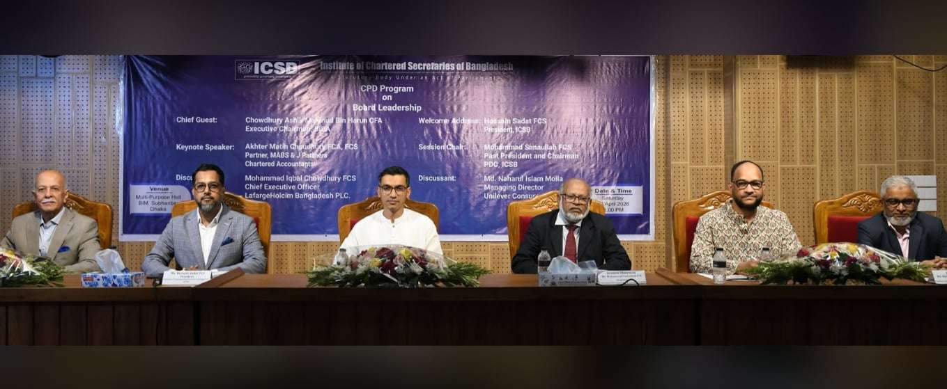 ইনস্টিটিউট অব চার্টার্ড সেক্রেটারিজ অব বাংলাদেশ-আইসিএসবি) ‘বোর্ড লিডারশিপ’ শীর্ষক একটি কন্টিনিউইং প্রফেশনাল ডেভেলপমেন্ট (সিপিডি) প্রোগ্রাম আয়োজন করেছে। গত ১৮ এপ্রিল রাজধানীর বাংলাদেশ ইনস্টিটিউট অব ম্যানেজমেন্ট-বিআইএম-এর মাল্টি-পারপাস হলে এ অনুষ্ঠান অনুষ্ঠিত হয়।