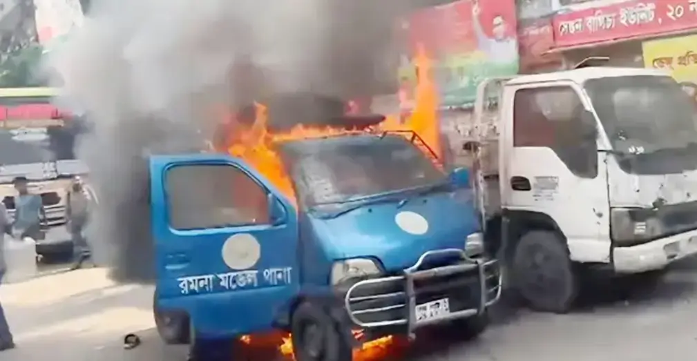 রমনা থানার সামনে পুলিশের গাড়িতে আগুন