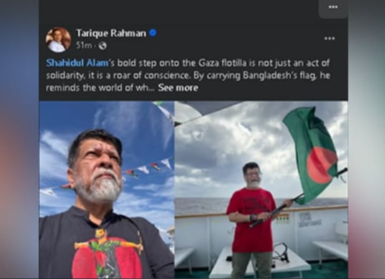 পোস্টে তারেক রহমান লিখেন, ‘গাজামুখী নৌবহরে অংশ নেওয়া শহীদুল আলমের উদ্যোগ কেবল সংহতির প্রতীক নয়, এটি বিবেকের এক গর্জন। বাংলাদেশের পতাকা বহন করে তিনি বিশ্বকে স্মরণ করিয়েছেন-বাংলাদেশের জনগণ কখনও নিপীড়ন ও অবিচারের কাছে মাথা নত করেনি, ভবিষ্যতেও করবে না।’