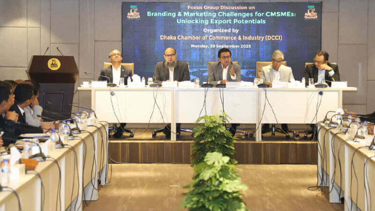 সোমবার (২৯ সেপ্টেম্বর) ডিসিসিআই মিলনায়তনে ‘সিএমএসএমই খাতের ব্র্যান্ডিং ও বিপণন চ্যালেঞ্জ : রপ্তানির সম্ভাবনা’ শীর্ষক আলোচনা সভায় এসব মতামত উঠে আসে। সভায় প্রধান প্রবন্ধ উপস্থাপন করেন ডিসিসিআই সভাপতি তাসকীন আহমেদ। তিনি বলেন, দেশের শিল্পখাতের প্রায় ৯০ শতাংশ সিএমএসএমই, যেখানে ১ কোটি ১৮ লাখ মানুষ কর্মরত। জিডিপিতে অবদান থাকলেও শ্রীলঙ্কা, ভিয়েতনাম ও কম্বোডিয়ায় খাতের অবদান প্রায় ৫০ শতাংশ।